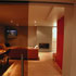 De inkomhal werd gedomineerd door een hele reeks deuren die hier uitkwamen. 1 deur kon er gesupprimeerd worden, de anderen worden uit het zicht onttrokken door een strategisch geplaatste vestiairekast. De belangrijkste deur (naar de woonruimte) werd vergroot en vervangen door een glazen schuifdeur. Ruimtelijkheid gegarandeerd!
